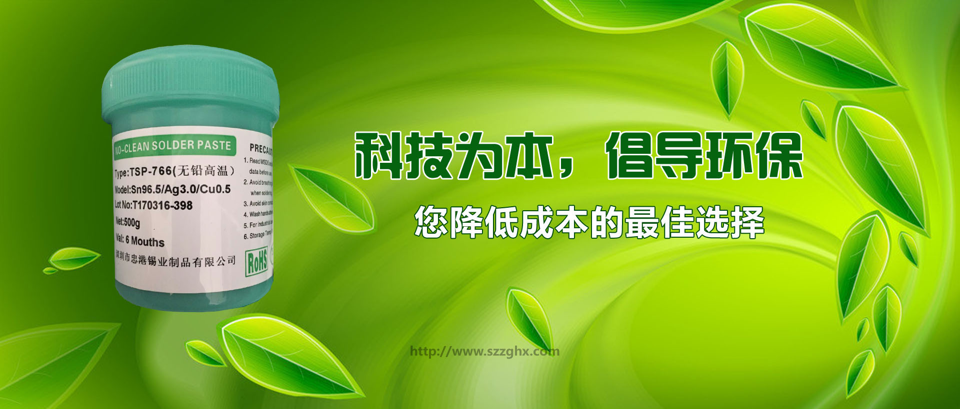 |  |  | 深圳市忠港錫業(yè)制品有限公司以專業(yè)生產(chǎn)、經(jīng)營各種規(guī)格和用途的無鉛焊錫,環(huán)保焊錫,焊錫絲,焊錫條,焊錫線,焊錫膏,低溫錫線,焊鋁錫絲,不銹鋼焊錫絲,無鉛錫條,無鉛錫絲,無鉛錫膏, 無鉛低溫焊錫絲,無鉛免洗助焊劑,環(huán)保助焊劑,焊鋁助焊劑,焊鋁錫條,水溶性焊錫絲,不銹鋼助焊劑等為主的電子化工輔料企業(yè)。無鉛產(chǎn)品己通過SGS檢測,并獲中國中輕產(chǎn)品[質(zhì)量、信譽(yù)雙保障示范單位]和國際ISO9001:2000質(zhì)量認(rèn)證。